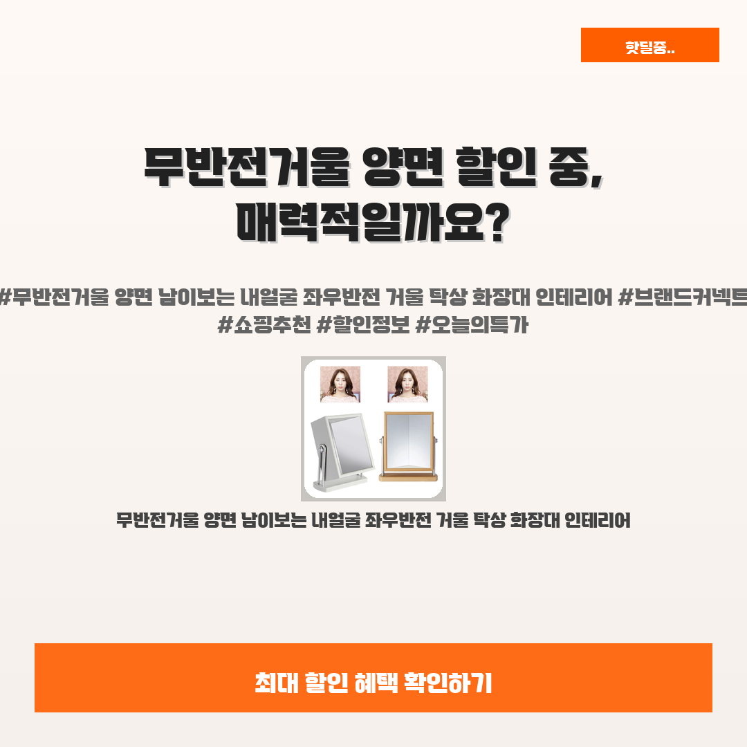 🛍️ 이 포스팅은 네이버 쇼핑 커넥트 활동의 일환으로,판매 발생 시 수수료를 제공받습니다.오늘 소개할 제품은 단언컨데,,바로 무반전거울 양면 남이보는 내얼굴 좌우반전 거울입니다!매일 아침 거울 앞에서 나의 모습을 확인하며, 혹시 좌우가 반전되어 보일까 걱정한 적 있으신가요? 이제는 그런 걱정 없이 자연스럽게 내 모습을 확인할 수 있는 기회를 드립니다.무반전거울 양면은 화장대 인테리어와도 완벽하게 어울려, 아름다운 뷰를 선사해줍니다. 가격도 정가 32,900원이 단 32,000원으로 할인 중인데, 이 기회를 놓치지 마세요!여러분의 일상을 더 특별하게 만들어 줄,무반전거울 양면 거울 지금 확인해보세요!무반전거울 양면 남이보는 내얼굴 좌우반전 거울 탁상 화장대 인테리어2% 32,900원32,000원네코네코샵..
